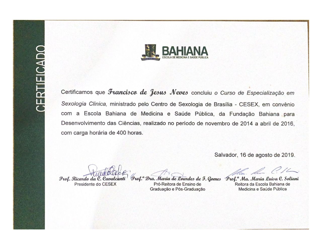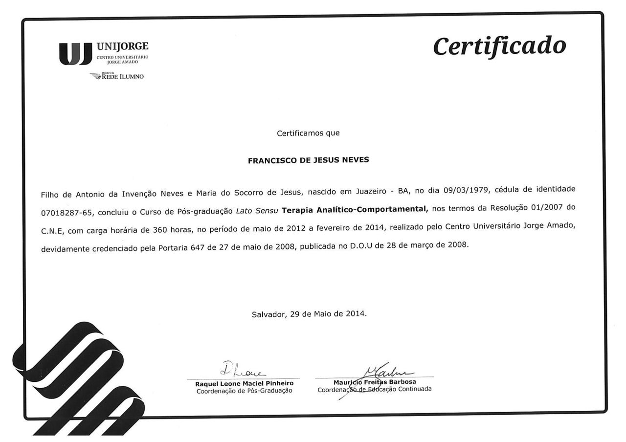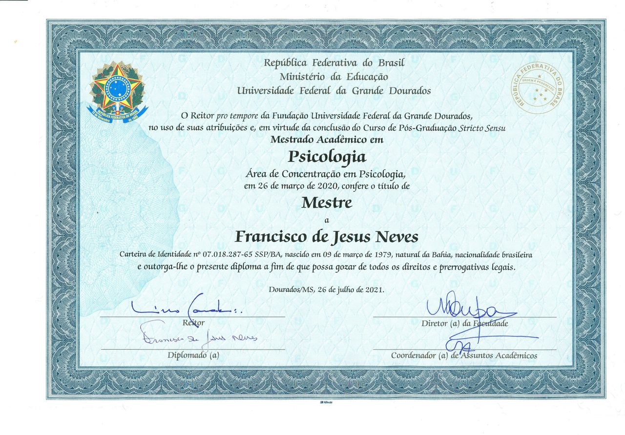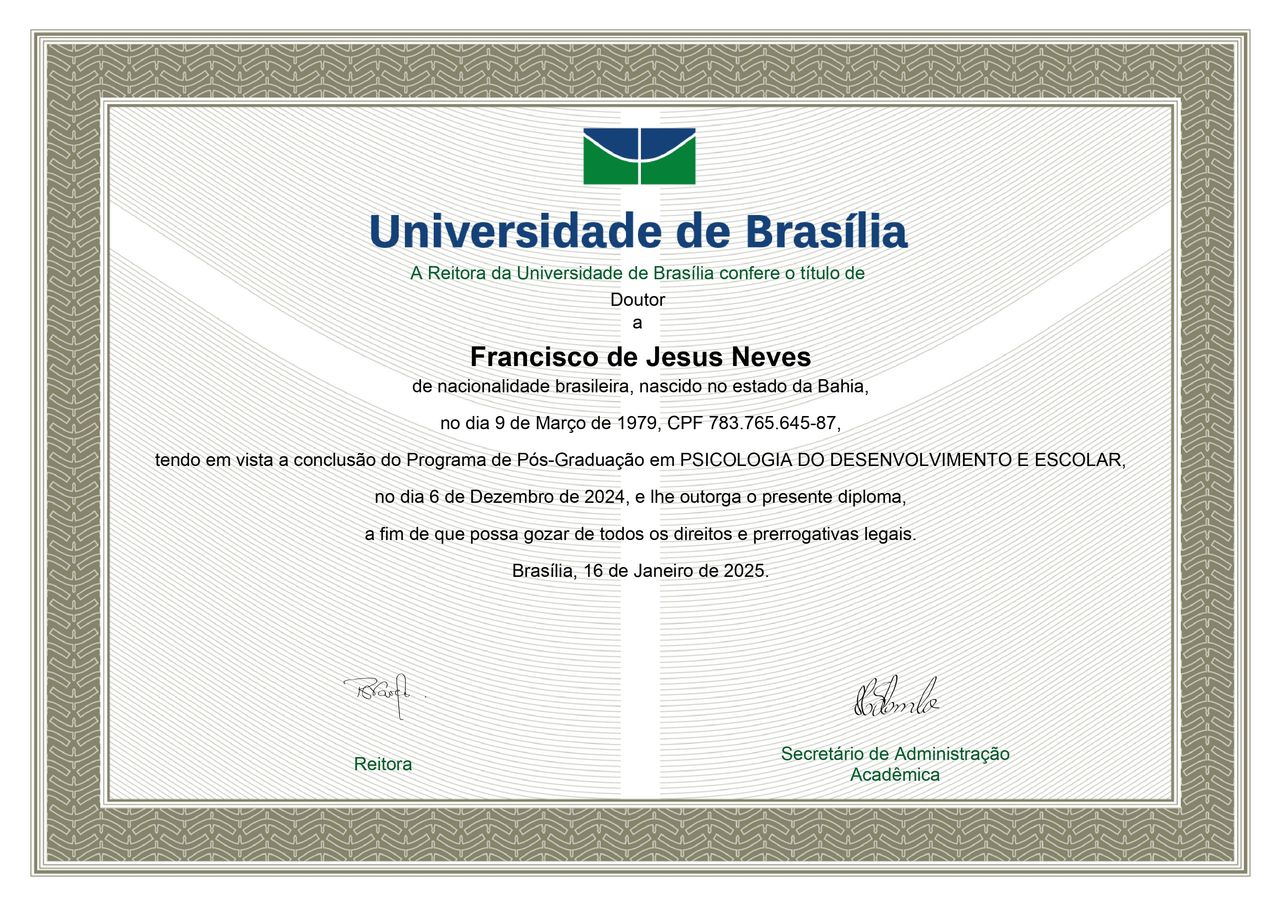 Sou Doutor em Psicologia pela Universidade de Brasília (UnB), com especialização em Terapia Analítico-Comportamental pelo Centro Universitário Jorge Amado (UNIJORGE) e formação em Sexologia Clínica pela Escola Bahiana de Medicina e Saúde Pública (EBMSP) e pelo Centro de Sexologia de Brasília (CESEX).